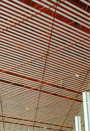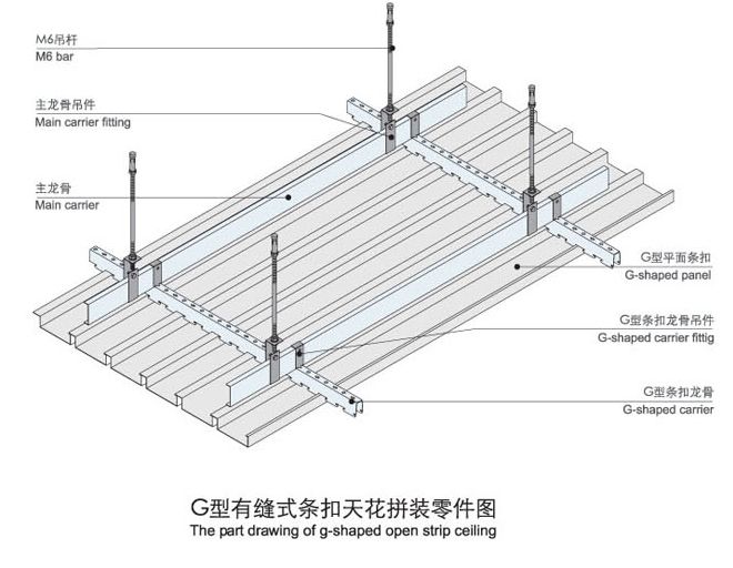 G型有缝式条扣板采用铝合金平板或冲孔板经静电喷涂而成,具有防火、防潮,吸音功能,板面及线条的整体及连贯性强,给人一种舒适畅快之感受。广泛用于机场、大厅、车站及走廊通道等方面。